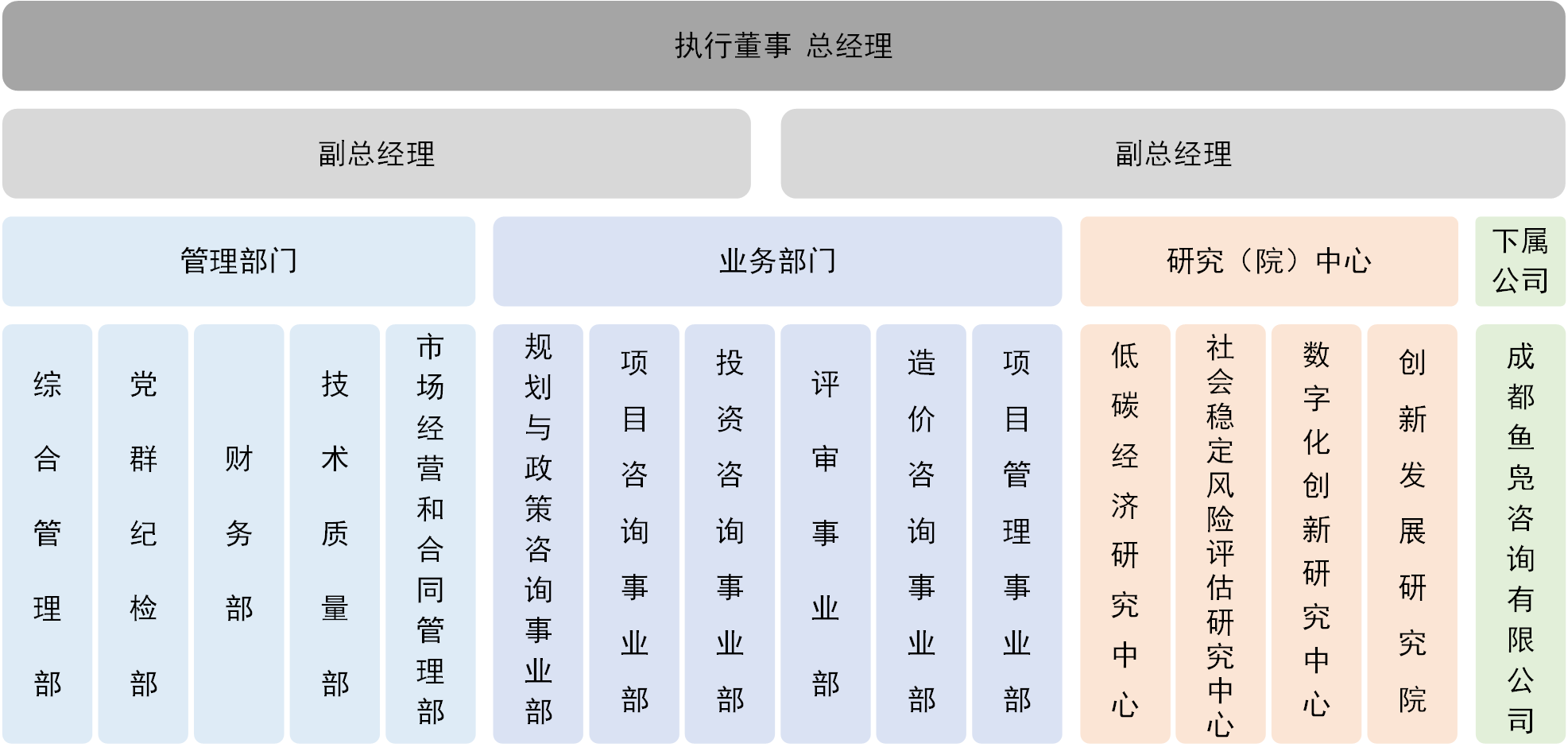 公司本科及以上學(xué)歷員工占比93%,碩士及以上學(xué)歷員工占比47%;正高級(jí)工程師7人,高級(jí)工程師28人,擁有全國(guó)咨詢工程師(投資)、全國(guó)注冊(cè)造價(jià)工程師以及注冊(cè)城鄉(xiāng)規(guī)劃師等各類專業(yè)技術(shù)資格人才占比超過(guò)65%。公司下設(shè)11個(gè)部門,4個(gè)研究(院)中心。其中,業(yè)務(wù)部門6個(gè),包括規(guī)劃與政策咨詢事業(yè)部、項(xiàng)目咨詢事業(yè)部、投資咨詢事業(yè)部、評(píng)審事業(yè)部、造價(jià)咨詢事業(yè)部和項(xiàng)目管理事業(yè)部;4個(gè)研究(院)中心分別為低碳經(jīng)濟(jì)研究中心、社會(huì)穩(wěn)定風(fēng)險(xiǎn)評(píng)估研究中心、數(shù)字化創(chuàng)新研究中心和創(chuàng)新發(fā)展研究院。公司現(xiàn)有控股子公司一家,為公司與溫江區(qū)屬國(guó)有公司合資成立的成都魚(yú)鳧咨詢有限公司。